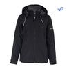The Boeing Women's 3-in-1 Systems Jacket by BOEING is a black, wind-resistant hooded jacket featuring a front zipper, two zippered chest pockets, and a left sleeve zip pocket, shown on a white background.