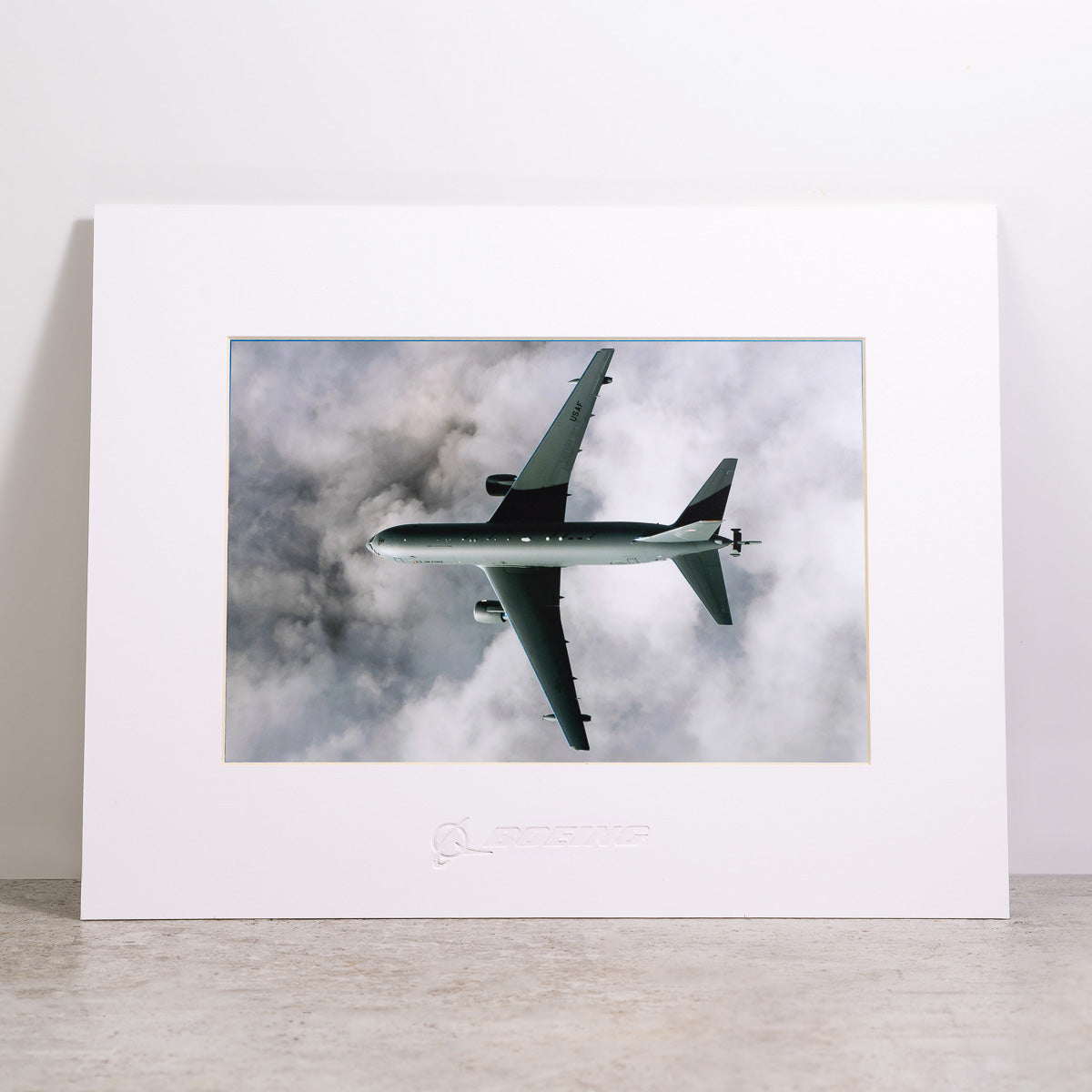The Boeing Store's Boeing KC-46A Tanker Matted Print - Small is a framed, high-res digital artwork showing the jet flying above clouds, viewed from below. Displayed upright on a light surface with a plain background.